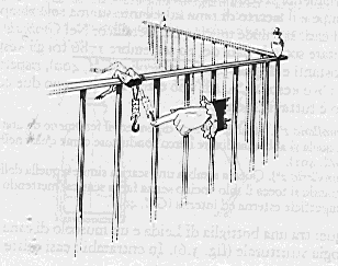 Mentre svolge tali esperimenti, Galvani si accorge che, appoggiando la rana su una ringhiera metallica, le contrazioni avvengono anche senza scariche elettriche esterne, solamente per lo stabilirsi del collegamento metallico tra nervo e muscolo tramite la ringhiera e luncino metallico conficcato nella colonna vertebrale.